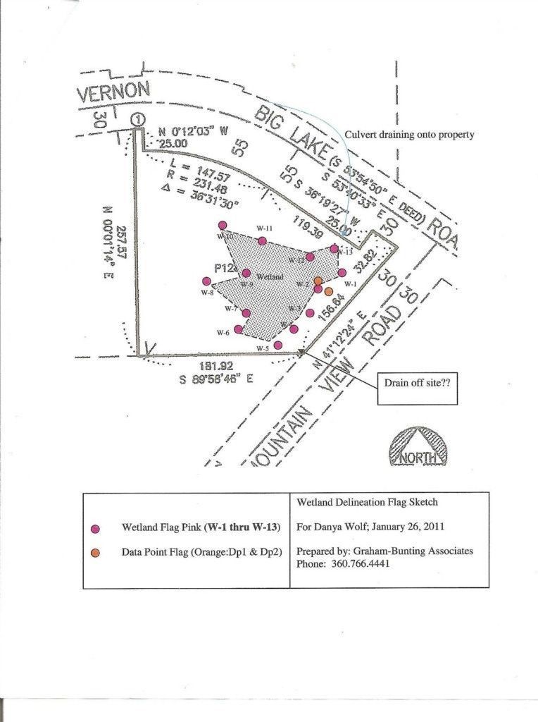 Located just outside the Mount Vernon city limits, this wooded 1 acre plus lot could be a building site for a stick built, modular, or manufactured home, with plenty of room. Tract has been surveyed (LeGro and Associates) and wetlands have been delineated (Oscar Graham and Pat Bunting). Power and PUD water available at street. Perc test performed/three bedroom on site septic system possible, permit #SW22-0073. Harriet Rowley Elementary School. Note: Building site for 1499 sq. ft. split level home is located (perc test for conventional system) to the west of what is outlined in the "greyed in" wetlands sketch. For clarification: one builds outside of the wetlands area.