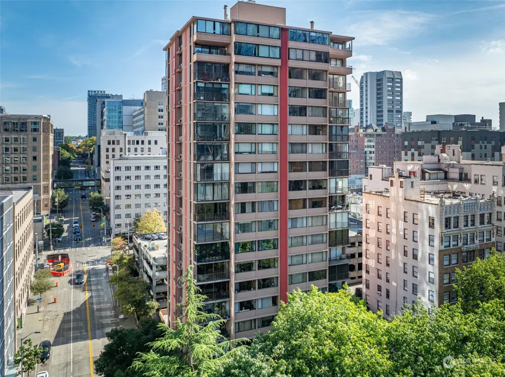 Welcome to the heart of Seattle. If you've been searching for an affordable home with all the benefits of city living, you're in the right place. This 2-bedroom, 1 3/4-bath high-rise condo is a blank canvas ready for your personal touch. It has a stacked washer and dryer, a secure parking garage, and additional storage. Common area amenities include an expansive patio, a fully equipped gym, and a large TV lounge with an entertaining kitchenette. Outside your lobby door, you can walk to shopping, dining, nightclubs, and theaters or catch one of Seattle's premier sporting events. If all this isn’t enough, you’ll find it easy to get out of town as the entrances to I-5 and I-90 are just minutes outside your garage.