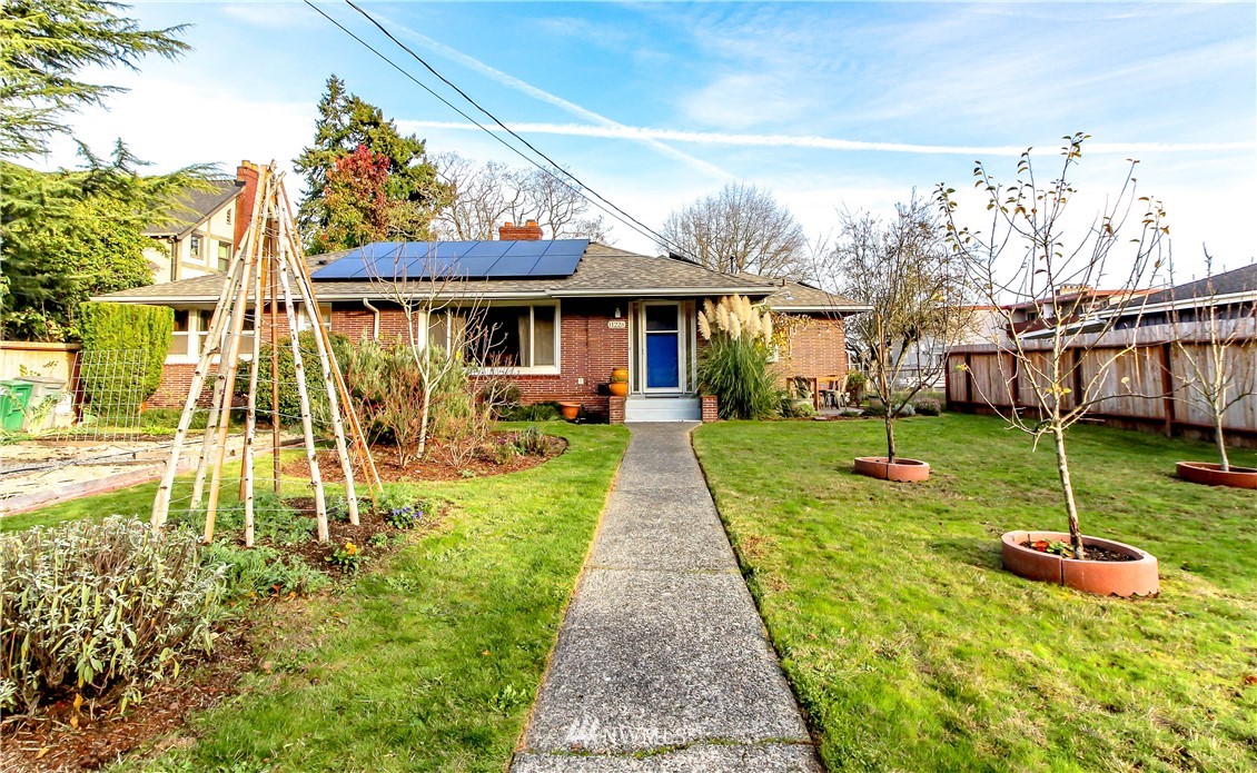 Classic Tudor rambler featuring an urban farm oasis. This large level lot offers mature gardens with many fruits, vegetables & herbs. Generous size front yard w/seating, back yard has an expansive covered patio for year round entertainment. Enjoy no maintenance solar panels with 102% energy efficiency! This well cared for home has a spacious layout with gas fire place, newly painted living room & new flooring in main bath + laundry. Kitchen features updated Quartz countertops/backsplash, tile flooring & charming built ins. Recently updated 1/2 bath, newer roof with warranty & 4 outbuildings for plenty of storage. Easy commute to downtown Seattle, Seatac Airport, and freeway access. Enjoy local amenities such as parks, restaurants & shops.