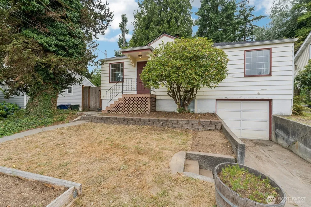 Charming 2 bedroom high off the street in popular Olympic Hills. Hardwood floors throughout main level. Large windows in living & dining rooms, bringing tons of natural light plus a wood burning fireplace. Spacious kitchen w/ample cabinet & countertop space. 2 tiered private backyard is fenced, level & awaiting your creativity. North side yard brings further privacy & a gardening opportunity. Lower level, a project in wait with good ceiling height and plumbed for a 2nd bathroom. Extensive storage below plus a one car garage with work bench. New roof in June '25, gas furnace and mostly updated plumbing. 5 minutes to I-5. 20 minute walk, less than a mile to future 130th Street light rail station. 1/2 mile to 8 years young Olympic Hills Elem.