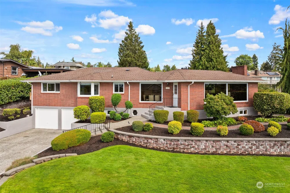 Sound, Bridge & Olympic Mtn views embrace this pristine, brick mid-century home, showing up in all its splendor. Original rich, but newly refinished hardwoods grace the main level, pairing with the oversized wood trimmed windows of the mid 1950s for that timeless, warm ambiance. Gorgeous living room sandstone fireplace & accents of the day. While keeping the best original features, this home offers all updated bathrooms. Spacious main level primary has its own 3/4 ensuite bath. 2 additional bedrooms on main. Lower level has extensive heated tile flooring, an ensuite bedroom, utility room anyone would envy and expansive rec room for all types of playtime! Huge, manicured yard is fully fenced. Newer roof & hot water tank. Heat Pump with AC.