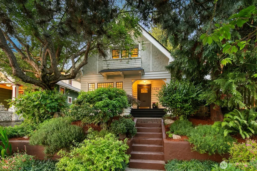 Tucked in N. Admiral's heart—serene, secluded, and soaring w/rooftop views. Timeless Craftsman soul graces every corner, embraced by old-growth trees & lush, mature gardens. Cherished historic touches include original Batchelder tile, coved ceilings, built-ins, fir floors, and a graceful double staircase. A light-filled addition expands off the kitchen and unveils a sun-washed family room. Above it, a generous primary suite w/walk-in closets, lead to the rooftop deck & sweeping 200° views—from Elliott Bay to golden sunsets. Detached garage, finished basement & abundant storage. Fresh paint inside/out, new carpet, & thoughtful upgrades throughout. One block to Hamilton Viewpoint Park & close to buses heading to Alki or up to Admiral shops.
