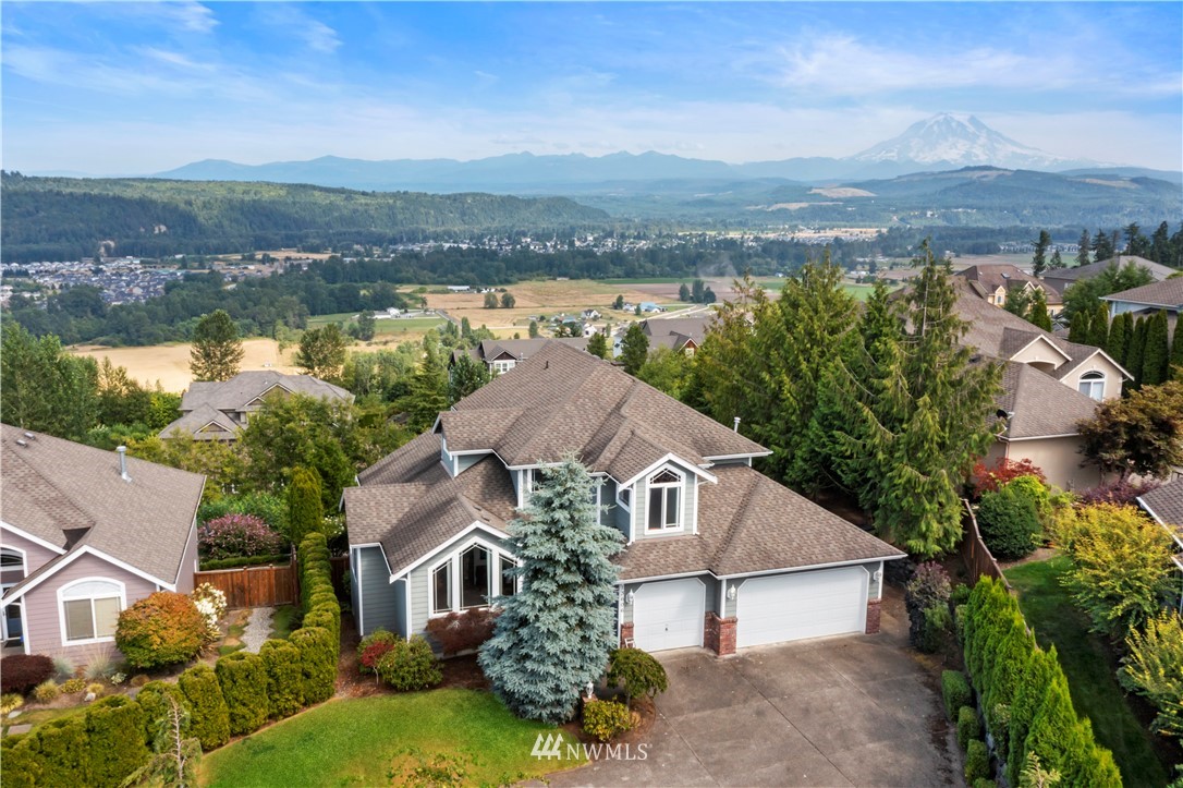 Beautiful spacious home with stunning territorial & Mt view from almost every room. Great room concept w/ fireplace, Dining Nook, open kitchen with walk in pantry, family room & Dining room. Extended deck includes main floor Master with 5 pc bath. Upstairs has 2 additional bedrooms, one with scenic balcony. Bonus room, which can be a 4th bedroom, & full Bath up as well. Unfinished, walk in crawl space has window and can be converted into so many uses. Beautiful Sunrise community includes clubhouse, playground, tennis courts, and community parks. Fenced custom landscaped yard. AC, security system, Puyallup schools and so much more!