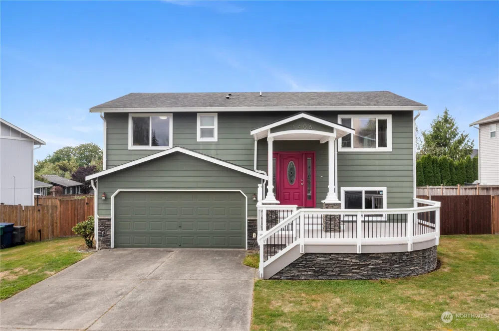 Welcome to this stunning 4 bed/2.5 bath home! Beautiful hardwood floors create a warm, inviting atmosphere throughout the light and bright open living space. The kitchen features SS appliances and an eating island. Enjoy peek-a-boo Olympic Mountain views from the large patio, or relax on the spacious deck leading to a fenced backyard. Upstairs has 3 bedrooms offering ample space for rest and relaxation. Downstairs, find a fourth bedroom plus a bonus living area, adding versatility for entertaining. A 3/4 bath with laundry has convenient backyard access. The home also includes a hydronic heating system with a power vent water heater and a 2-car garage with ample storage. Close to Hwy 2, I-5, Hwy 9. Desirable Lake Stevens Schools.