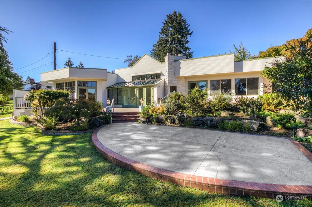 A world of privacy, serenity & Lakefront + mtn views in this custom crafted home where visual reward & functionality reign. A major 1990 remodel infused a hint of Frank Lloyd Wright inspiration thru-out with dramatic lines, rounded surfaces & ceiling modulation - while appointed with modern features for easy living & entertaining inside & out. A chef's kitchen w/ granite counters, eat'g bar, 6 burner Dacor gas stove, walk-in pantry, etc. Lg adjoin'g dining area, sunken Living Rm w/ gas frplc & atrium-style window wall. Lg laundry rm & sep storage rm, Tankless Hot Wtr, Sauna, Aux. Pwr, Ht Pump, Det 3-car Gar + shop area. 2 concr patios, priv Hottub. Priv dock & secluded grounds w/irrigation system. A premier Lk Burien waterfront location.