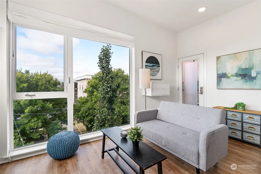 Welcome to your sunlit sanctuary! This top-floor unit offers tons of natural light through the expansive floor-to-ceiling windows & the custom top-down-bottom-up shades provide flexible control over light & privacy. Living room features a cozy nook, perfect for work from home w/ a distinct separation from the rest of the living space. Spa-like bathroom w/ an extra deep tub surrounded by solid marble. Equipped w/ Smart Wi-Fi & voice assistant-compatible light switches, door lock, & thermostat, ensuring convenience & control at your fingertips. Secure parking spot & storage space. Fabulous rooftop deck w/ BBQs & views of the Seattle skyline. Close to restaurants, grocery stores, parks & more. No rental cap & short term rentals permitted!