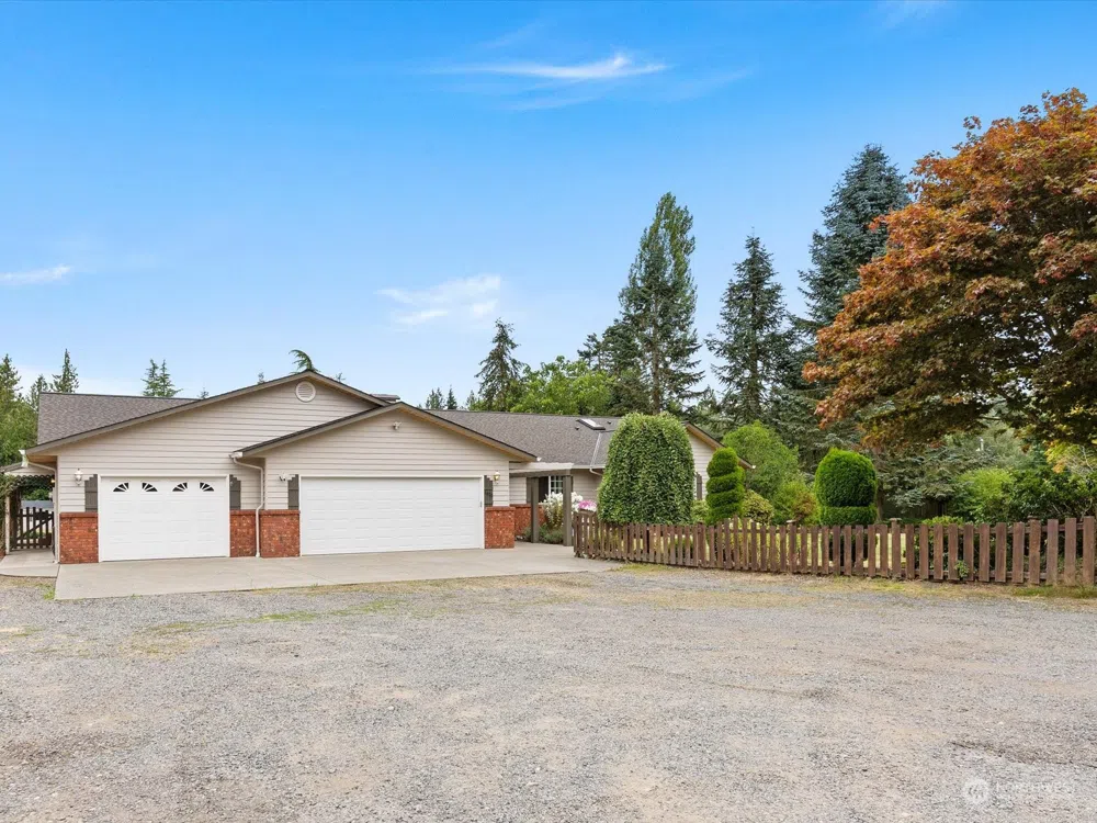 Nestled on nearly 2.5 acres, this home offers the perfect blend of comfort & convenience. 3 spacious bedrooms+bonus room. 2.5 baths, a welcoming great room, & beautiful hardwood floors. Updated kitchen w/granite countertops & plenty of space for culinary creations. Primary suite complete w/full bath & walk-in closet. Step outside to the covered deck, ideal for hosting gatherings, & take in the expansive backyard w/barn, garden shed & sports court. Explore the lush garden, pick fresh berries, & enjoy evenings around the firepit. Abundant storage, oversized 3-car garage + shop/work space. Barn includes a tack room, 1.5 stalls, electricity & water. RV parking & easy access to I-5, this home combines country living with modern convenience.