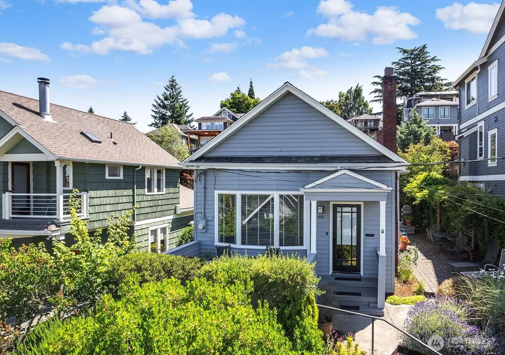 Light, bright & above it all this 1906 Craftsman features a light-filled open concept tastefully updated to contemporary standards. 3 bedrooms & 2 baths on a lushly landscaped lot with an unobstructed view from a wall of western windows to the Olympics & partial Elliott Bay views. Gorgeous hardwood floors throughout compliment the period detail of mantled fireplace & built-in bookcases typical of this vintage. The thoughtful 3 point plan of range-frig-sink will save steps.There is ample prep, cupboard & cabinet space here to please the chef. The primary bedroom & bath sits quietly at the back of the house looking out over the gardens, with two more guest bedrooms serving as office or daybed. Here you'll enjoy outdoor living all summer long!