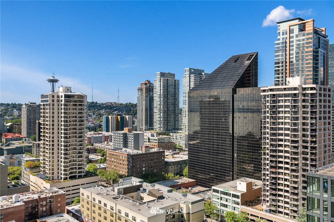 Luxury living at Cristalla. Perched high above on the 18th floor, enjoy Space Needle & city views from your unit. Open layout w/ built-ins & fireplace in living room & kitchen w/ granite counters, gas cook-top & SS appliances. Spacious bedroom w/ large walk-in California closet. World-class amenities: 24/7 concierge, gym, hot tub, saunas, roof top deck, guest suite, dog run & more. Secured parking & storage space. Perfect location w/ Pike Place Market, Seattle Center, restaurants & more nearby.