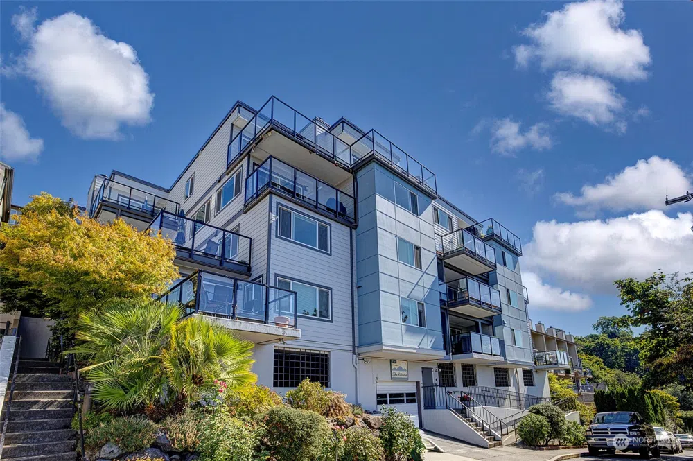 Sweeping and unobstructed western views of the Puget Sound, Olympic mountains and golf course from two decks that are over 250 sq/ft. Enjoy the sunset from every room of this top floor condo. Two huge bedrooms and two bathrooms, very large living room with fireplace with direct access to the stunning viewing decks. Amazing open floor plan perfect for entertaining. Lots of closets, two assigned parking spaces are just a few features of this very unique condo. Less than 15 min to downtown Seattle and South Lake Union and steps away from shopping, dining, coffee shops and everything we love on Queen Anne. Building is in excellent condition with great management.
