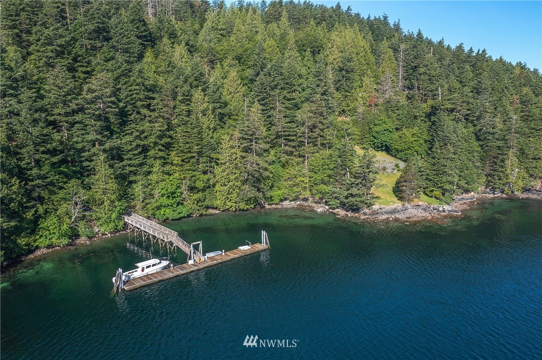 Ten end of the road waterfront acres--770' of frontage w/ 110' of hard pier, deep water, year around dock space (two 55' slips on the north half of the dock) on Dolphin Cove, East Sound. Enjoy a lovely sand/gravel beach w/ space to launch a kayak & relax. Buildings include one bedrm, 3/4 bath apartment, separate bunkrm w/ 3/4 bath, office w/ washer/dryer, 3 car garage, covered deck, dog kennels, workshop,4 horse stalls, wood shed, tennis court pad, picnic area, & several possible locations for a main house. One of the largest permitted docks in the county w/ the subject property owning 50%, 2 other parties have 25% each & use separate access road. Water, power & fire suppression on the dock, ramp accommodates an atv. Land division possible.
