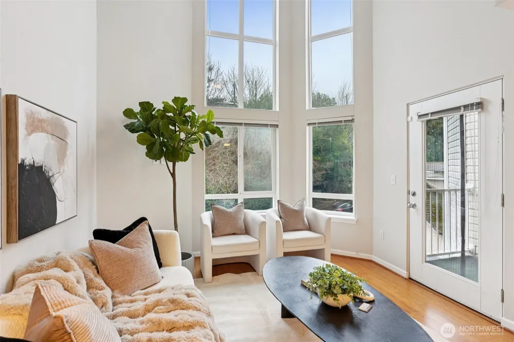 Water views in the heart of Interbay! Enjoy sweeping views of the Puget Sound and Olympic Mountains from this top-floor home with a quiet rooftop deck – set above the city and well suited for relaxing, entertaining, or enjoying sunsets – plus an additional deck off the dining area for seamless indoor-outdoor living. Light-filled interiors feature a dramatic two-story vaulted ceiling with triple east-facing windows, bamboo flooring, and a convenient powder room for guests. The updated U-shaped kitchen offers white cabinetry, granite counters, a brand-new dishwasher, and opens seamlessly to the dining area. A flexible loft bedroom with ceiling fan and full bath provides privacy and versatility, while brand-new custom closet systems throughout maximize storage. Additional highlights include stacked ventless washer/dryer, fresh interior paint, and updated lighting and hardware. Secure elevator building with secure parking garage and ample storage unit directly across the hall. Convenient location near Whole Foods, shops, and breweries, directly across from Interbay Golf Center, and minutes from downtown Seattle, Ballard, and Queen Anne. A rare opportunity combining views, quiet outdoor space, updates, and location convenience. A must see!