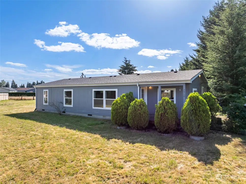 Quiet location at the end of a private lane with 3Bd 2Bth manufactured home on Large One+ Acre lot. Enjoy low cost of utilities on Private Well & Septic. Large primary Bedroom easily fits Cali-King bed, has walk-in closet & attached bath w/ soaking tub & separate shower. Kitchen w/ eating space, pantry & appliances stay. Large windows & skylights keep home bright & light. Garden shed, chicken coop, partially fenced. Country feel but Minutes from schools, shopping & easy I-5 access. Check out the video tours. You will love it.