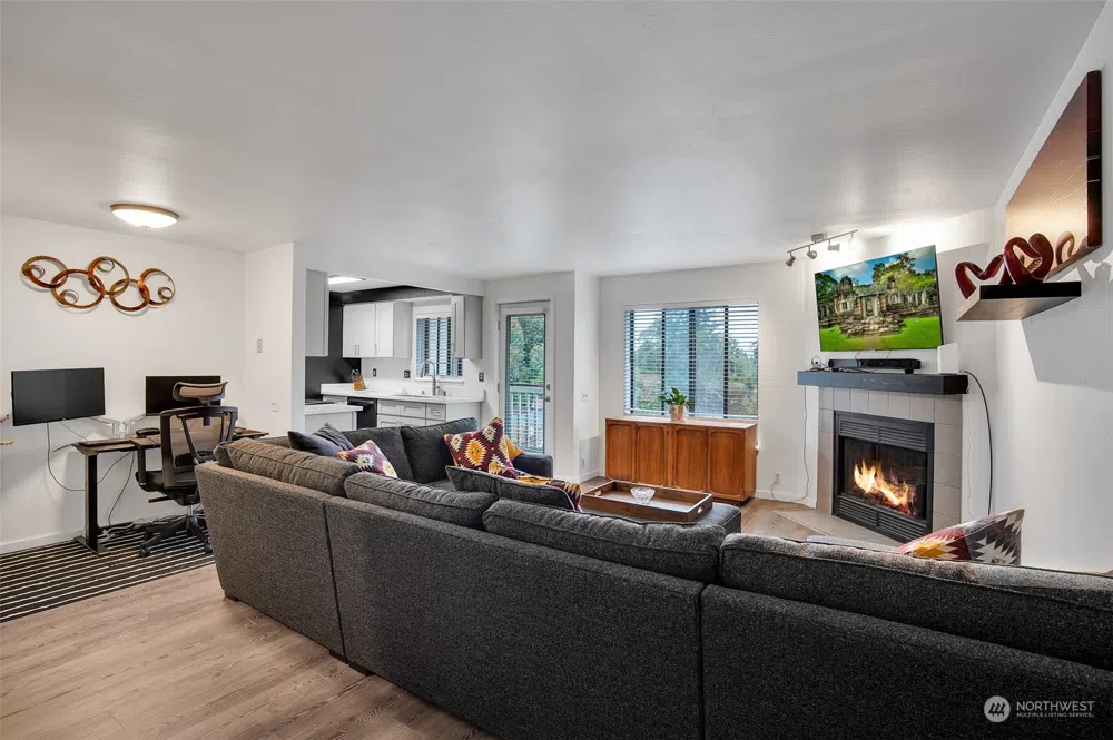 Why rent when you can own this beautiful updated condominium home and build equity for the future? There are 2 BR's and 2 full bathrooms. This great open floor plan features a tastefully appointed kitchen open to living/dining area accented by a cozy fireplace for those chilly days ahead! Good size primary bedroom with attached full bathroom. All appliances including washer/dryer to stay. Many upgrades throughout: quartz countertops, Shaker cabinets(soft close), new carpet, newer water heater, LED lighting, new blinds, Luxury Vinyl Plank floors, new refrigerator, new microwave and new toilets. Also featured are two covered parking spaces. Great location with easy access to I 5 and close proximity to shops, services, fine and casual dining.