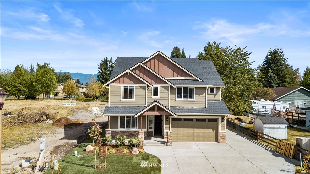 Ultimate Enumclaw experience! Now 99% complete, new construction on estate size lot. HUGE BONUS, 672 sq ft detached garage w/heat & power. Beautiful architecture, custom quality detailed finishes. Gets better…great-room concept with chef’s dream kitchen & huge island. Open living space with great site lines through a 12x8 wall of telescoping glass doors leading to spacious patio and gas fireplace. 42” cabinets, quartz counters, tankless H2O, upgraded SS appliances, barn doors, spa-like master suite. Other builder’s upgrades are standard features here. 2900 sq ft, 4 bed +office & 2.5 baths. Fenced, landscaped & sprinkler system.