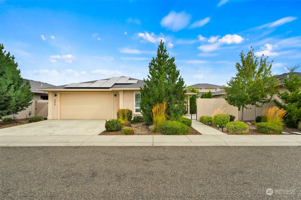 This 3 bed 2 bath Kestrel Point rambler offers a seamless blend of style and functionality. Enjoy an open floor plan w/ 9-foot ceilings, on-demand hot water, & a primary suite w/a large walk-in closet & double vanity, as well as level entry (no steps!). Fresh interior paint throughout, solid interior doors, quartz countertops, & custom built-in cabinetry in the kitchen add a touch of luxury. Effortlessly entertain w/ a fully fenced backyard, covered patio, and hot tub hookup. Enjoy your gas fire pit on the side patio in the warmer months and gas fireplace inside on those chilly fall & winter nights. Solar PV panels offset energy costs (close to net zero!). This meticulously crafted property is designed to meet your modern lifestyle needs.