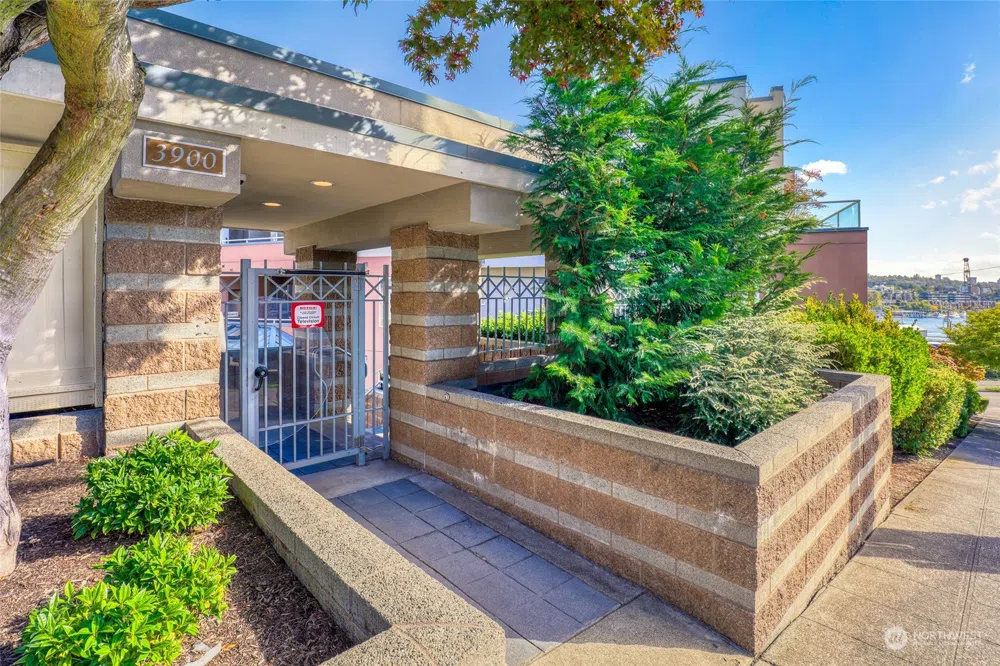 A west-facing, light-filled, ground level corner unit with all the bells & whistles. Open & flowing floorplan exudes style and comfort throughout. Snazzy kitchen boasts gas cooking, pantry and abundant cabinets. French Doors lead to a generous primary suite showcasing a double vanity, walk-in closet and direct patio access. Versatile 2nd bedroom offers a built-in desk for a home office option. 2 large, private patio spaces set this condo apart. Entertain on the north patio, or take in peek-a-boo city & water views from the west patio. 2 secure garage parking spaces, dedicated storage and a workout room. Overlooking the Burke-Gilman Trail, and just steps to the waterfront. Mere minutes to UW, hospital, Google and Adobe. Unbeatable location.
