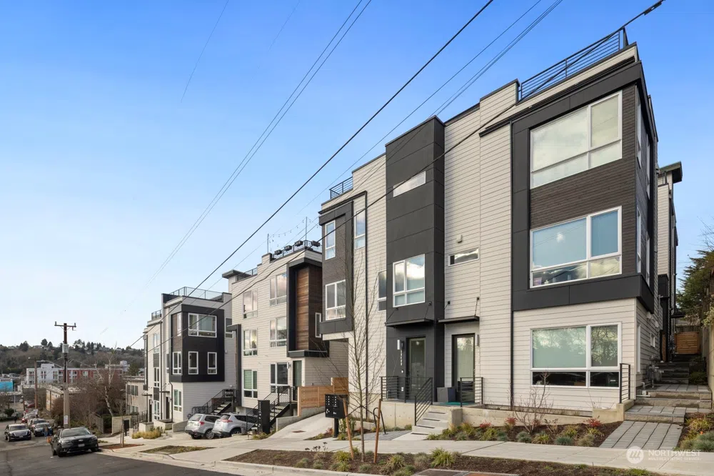 Step into modern living with this stunning Columbia City townhome! Situated on a quiet street, steps from vibrant bars, restaurants, and trails, with light rail access nearby. This light-filled, airy home offers a thoughtful layout that maximizes space. The entry level features a foyer, a bedroom with en-suite bath, large closet, and separate entrance—perfect for guests or rental potential. The second floor boasts high ceilings, a gas stove, cozy yet functional living space, deck, and a powder room. On the third floor, find the primary suite with a spacious bathroom, ample closet, and laundry. Finally, the southwest-facing rooftop deck offers sunset and territorial views, perfect for entertaining. A true gem in an unbeatable location!
