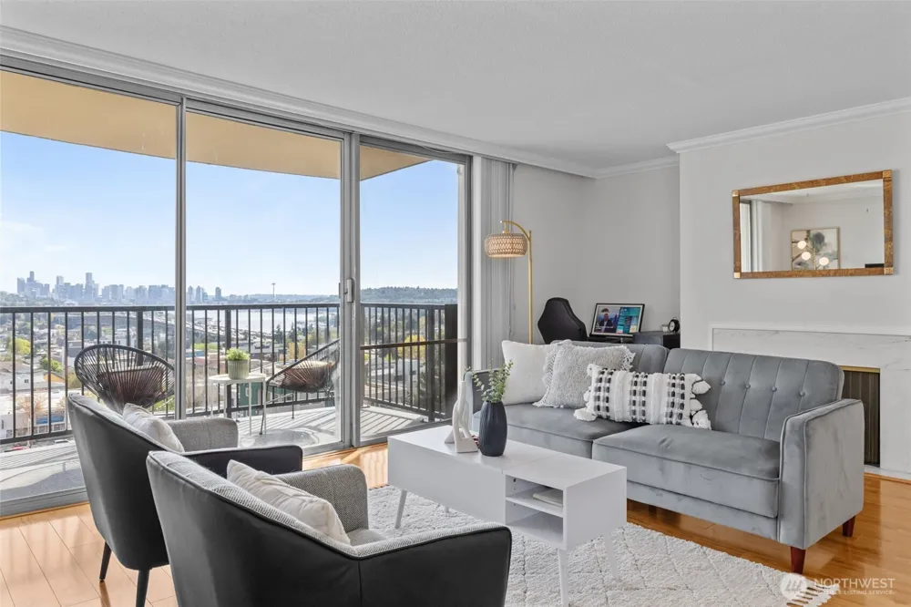 Welcome home to this picturesque 11th floor stunner. This end-unit condo features 2 bed | 1.75 baths + ensuite off the primary. Enjoy an open, light-filled layout with a south-facing kitchen, living/dining and bedrooms. Cook with ease thanks to ample counter and cabinet space, then unwind on the deck with sunset views of the Seattle skyline, lake union, and Mt. Rainier. The outstanding HOA amenities include: pool, gym, sauna, rec room, EV charging, private storage unit, and assigned garage parking stall (seller is also offering 2nd bonus parking option) HOA dues cover water, sewer, garbage, electricity & shared Wi-Fi. Prime location in a perfect walk score w/ easy access to transit, dining & entertainment. This is an incredible opportunity!