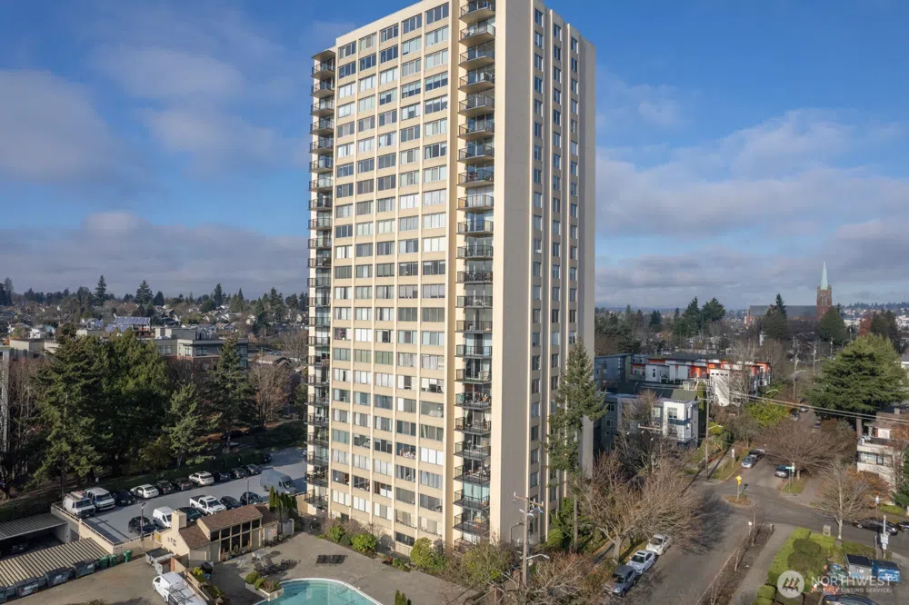 Iconic University Plaza, Light Filled, Expansive Views, Enormous Windows, and Private Covered Balcony. Access Your Covered Parking Space thru Secure Garage. In-Unit Washer and Dryer, Refrigerator 1 year New, Huge Closets, Plus storage Unit. "Walker's Paradise" 96 score, "Excellent Transit" Score 82. Less than a mile to UW Campus, 1.5 Blocks to Trader Joe's. Resort style Amenities, Sparkling Pool, Well-Equipped Fitness Room, Sauna, Community Room, Spacious Lobby, On-Site Manager. A Lot of Guest Parking, Electric Car Charger Station. HOA Covers Utilities and More. Outstanding Investment, 1031 Exchange, Tenant Occupied, or Move In! No Rental Cap!. Pet Friendly! Conventional Financing Available.