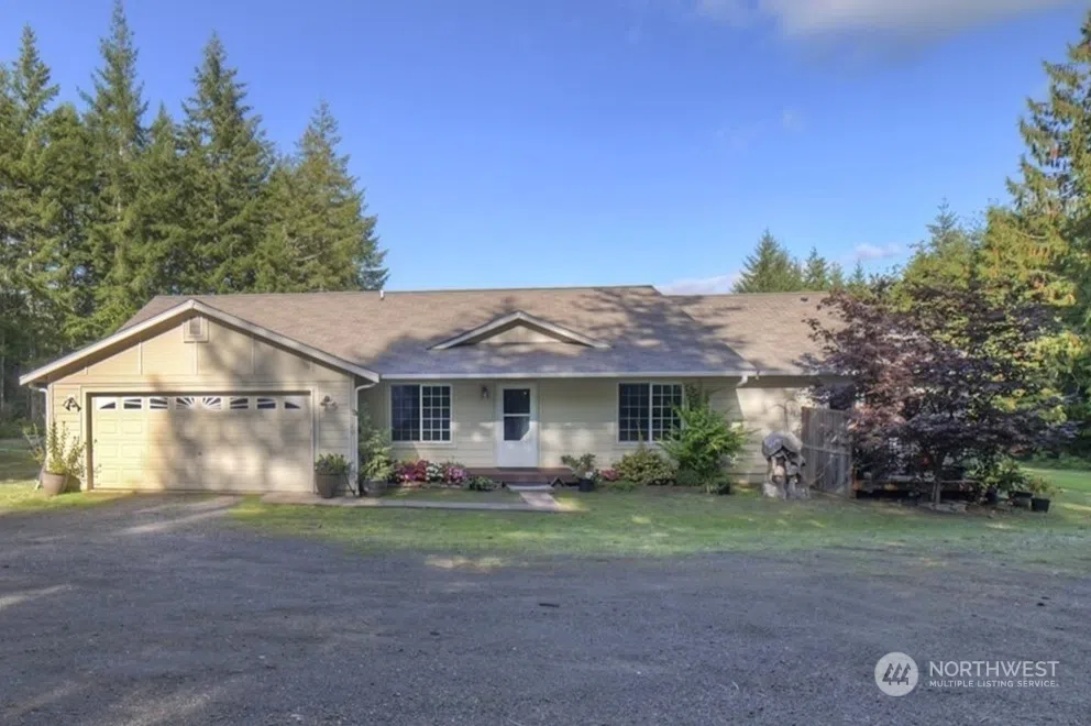 Serenity in the woods! Rare one level rambler on 4.96 acres. Inviting Great room w/ cathedral ceilings, skylights, gas fireplace & slider to large deck. Property features full R.V hookups, 4 Bdr septic, fenced yard w/ fruit trees - great for play & pets, 2 car-garage on private dead-end road only minutes to town.