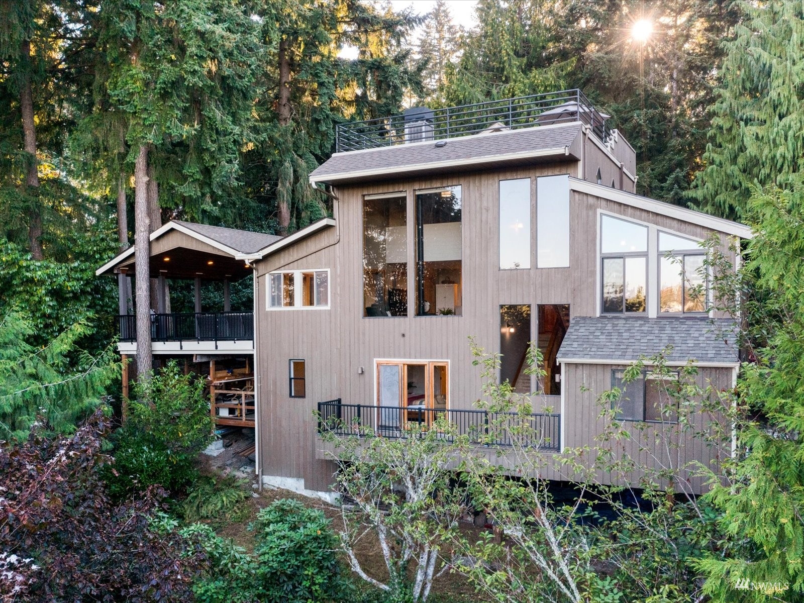 This stunning NW Contemporary home is nestled down a secluded street, & is located on beautiful 25K SF lot, offering incredible territorial views of the Cascade Mtns. This gorgeous home has been updated w/special attention to detail, offering quality features thru-out. Living Room opens to kitchen, has woodstove, 16' vaulted ceilings, floor-to-ceiling windows which look out to beautiful greenbelt. Kitchen remodeled in 2017 w/quartz counters, tile backsplash, Fisher & Paykel gas range & breakfast bar. Features include: 4 BRs (include 2-Primary Suites), 3 baths, loft family room, NW covered deck, large roof-top deck, sport court & mature landscaping. New Roof 2021. Great location, minutes to LFP Town Center, Lake WA, I-5 & 522 and Aqua Club.