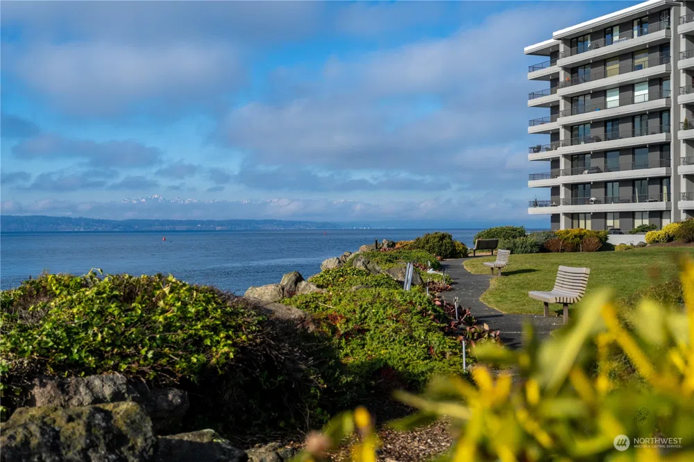 Imagine living at this exclusive, exquisitely landscaped gated condominium at water's edge with vistas of Shilshole Marina, Sound & Olympics. This home lives large with generous dimensions & plenty of windows & light. Spacious living room with dining area off kitchen. Two large bedrooms, one ensuite. Step out on the large balcony for fresh sea air & catch a glimpse of frolicking seals! Situated on 11 acres of manicured grounds along Shilshole Bay, with amenities such as heated pool & spa, workout room, party room, well equipped woodshop, EV chargers, RV parking & 24 hour guarded entrance. Moments to Golden Gardens beach, Ballard Locks, Shilshole Bay, Ray's Boathouse, Un Bien & easy access to downtown Ballard. Welcome home!