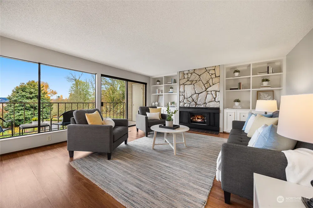 Experience gracious, one-level living in this rare, 3-bedroom corner unit with scenic views of the pool, mountains, and seasonal lake views. This home features hardwood floors, new carpet, and fresh paint. Spacious rooms and ample in-unit storage. Cozy up by the gas fireplace this winter. Generously sized deck with hook up for your grill. Enjoy resort-style amenities including an outdoor pool, fitness rooms, sauna, bike storage, and a community pea patch. HOA dues include access to SPGCC tennis courts and driving range. Fantastic location with easy access to Burke-Gilman Trail, Magnuson Park, and U Village. Well run HOA with onsite Manager. Resort living at its finest!