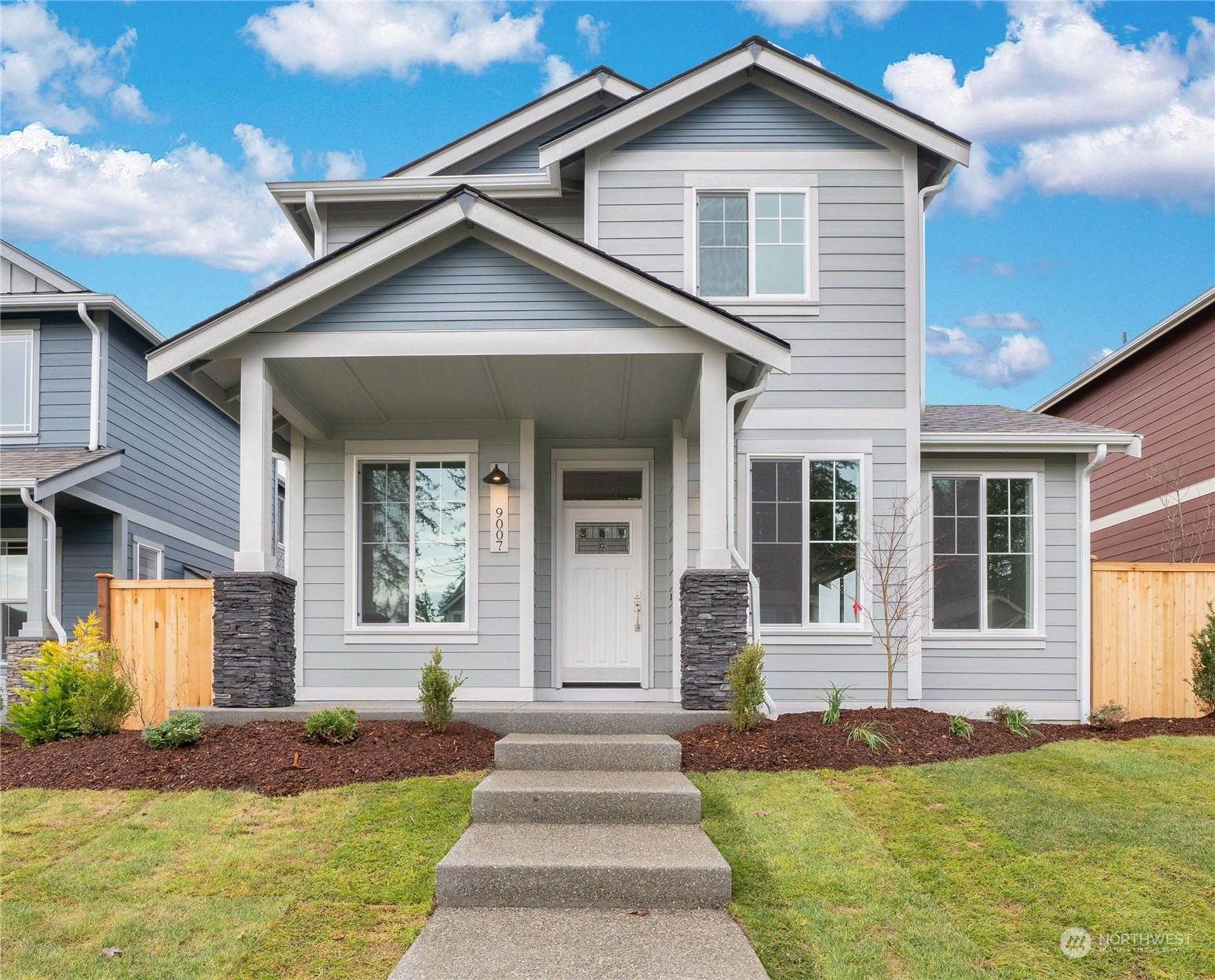 Charming cottage home from top local builder!The 1951 sq ft. Cypress plan offers 3 bdrm + loft and 2 1/2 baths.Interior options include contemporary style fixtures,hardware and trim molding,Shaker style shadow-stained maple cabinetry with full extension guides and soft close doors and engineered hardwood flooring.Luxury features throughout including a gas fireplace w/tile surround,spacious primary suite w/walk in closet and 5 piece bath featuring tile tub and flooring,kitchen w/stainless steel double oven gas stove,dishwasher,microwave,walk in pantry, and island w/storage and seating options.Home is light and bright with oversize windows and skylights.Covered patio and low maintenance front yard with sprinkler system maintained by HOA.