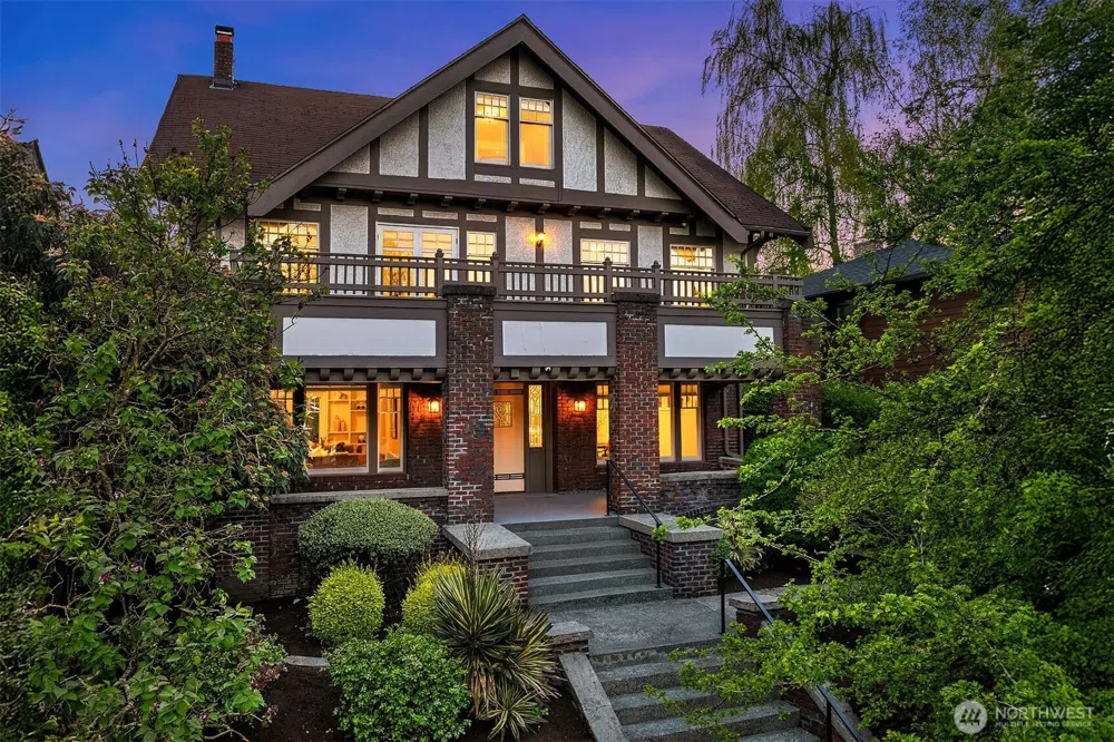 Welcome to this beautifully preserved Craftsman in North Capitol Hill, offering lovely eastern Cascade & Bellevue views. Rich in character, it features leaded stained-glass windows, oak floors with mahogany inlay, detailed millwork, and a cozy tile fireplace. The main floor includes formal living and dining rooms, a den, eat-in kitchen, and half bath. Upstairs you'll find 4 bedrooms, a secret room, 2 baths with heated floors, and a view deck. The top floor adds skylights, 2 more bedrooms, a ¾ bath, laundry, and flex space. Enjoy peaceful outdoor living with a private terrace, Ipe deck, and welcoming porches. Detached 2-car garage plus extra parking and easy access to the back entry. Unfinished basement with laundry and separate entrance.